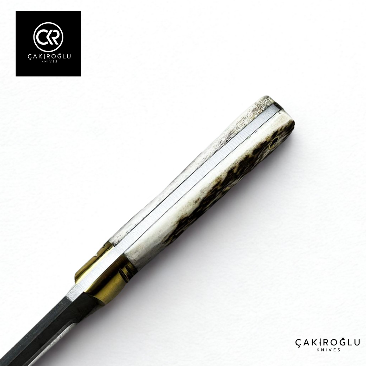 A true embodiment of craftsmanship and nature’s elegance. This exceptional bushcraft knife is forged from Damascus steel, renowned for its strength, durability, and mesmerizing pattern that tells the story of layered precision. The brass apron adds a refined, classic touch, perfectly complementing the natural warmth of the genuine deer antler handle. Every detail is shaped by hand, ensuring a perfect balance between functionality and timeless aesthetics. Designed for those who value both performance and artistry, this knife delivers reliability in the wild and beauty in the collection. An authentic Çakıroğlu creation — where heritage, mastery, and nature meet in perfect harmony.