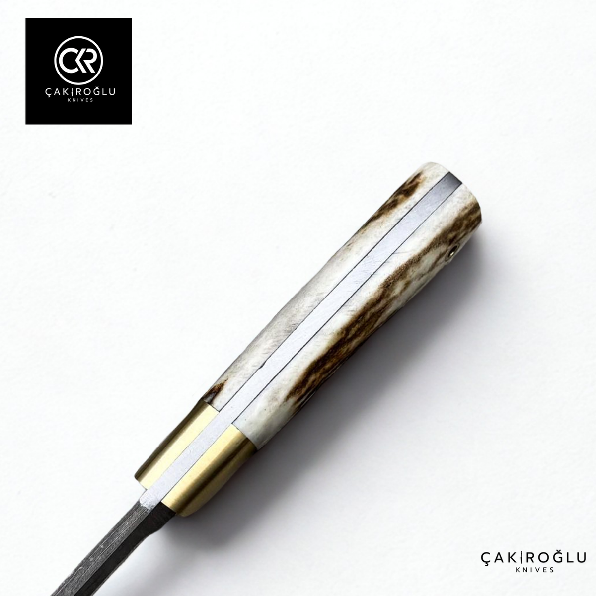 A true embodiment of craftsmanship and nature’s elegance. This exceptional bushcraft knife is forged from Damascus steel, renowned for its strength, durability, and mesmerizing pattern that tells the story of layered precision. The brass apron adds a refined, classic touch, perfectly complementing the natural warmth of the genuine deer antler handle. Every detail is shaped by hand, ensuring a perfect balance between functionality and timeless aesthetics. Designed for those who value both performance and artistry, this knife delivers reliability in the wild and beauty in the collection. An authentic Çakıroğlu creation — where heritage, mastery, and nature meet in perfect harmony.