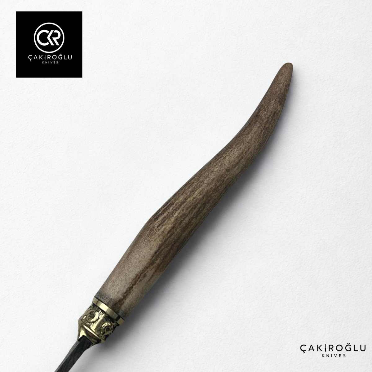 The natural deer antler handle adds a unique touch of nature, giving each knife its own character and texture no two are ever alike. Completing its refined design, the engraved brass bolster (apron) enhances both elegance and balance, blending seamlessly with the natural tones of the handle.