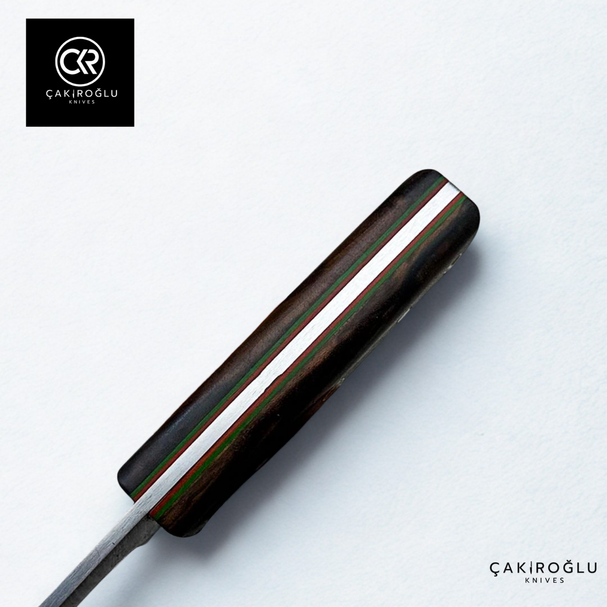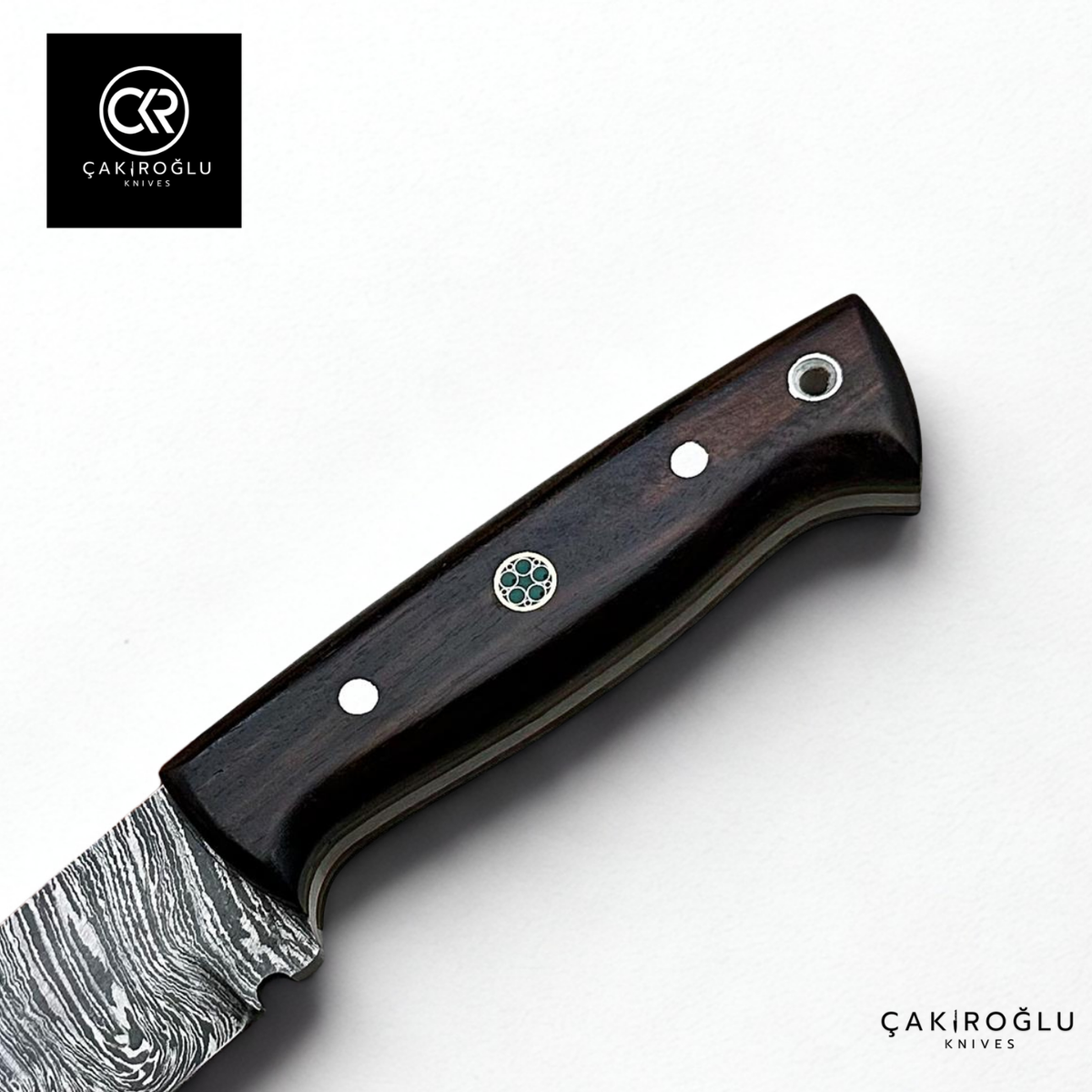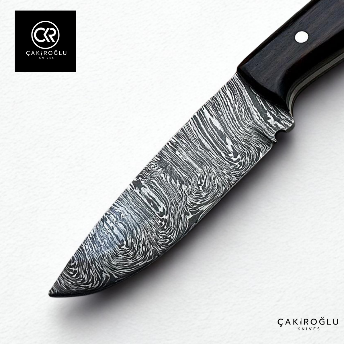 Crafted with the elegance of handcrafted workmanship, this Damascus steel bushcraft hunting knife masterfully combines performance with aesthetics. Each knife features unique Damascus patterns formed by hand hammering; these patterns add visual depth while providing superior sharpness and durability. The root walnut handle stands out with its natural texture and warm tones; each piece bears nature's own signature. The handle offers a comfortable grip while providing strength against external factors and resistance to moisture. Designed for bushcraft use, it is a reliable companion for camping tasks, whittling and carving, small nature projects, and all kinds of outdoor activities. Increasing in collectible value over time, this model is a masterpiece suitable for both use and display, thanks to the meticulous craftsmanship in its details.