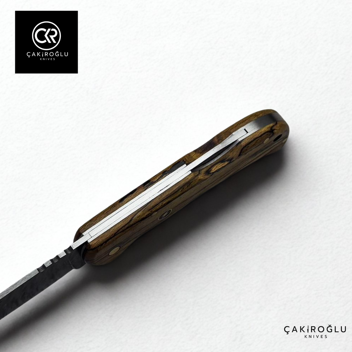 This specially crafted knife combines elegance and durability with a minimalist design approach. The natural zebrano wood handle stands out for its warm feel in the hand and stylish appearance, while its lack of a apron reflects the elegance of simplicity.