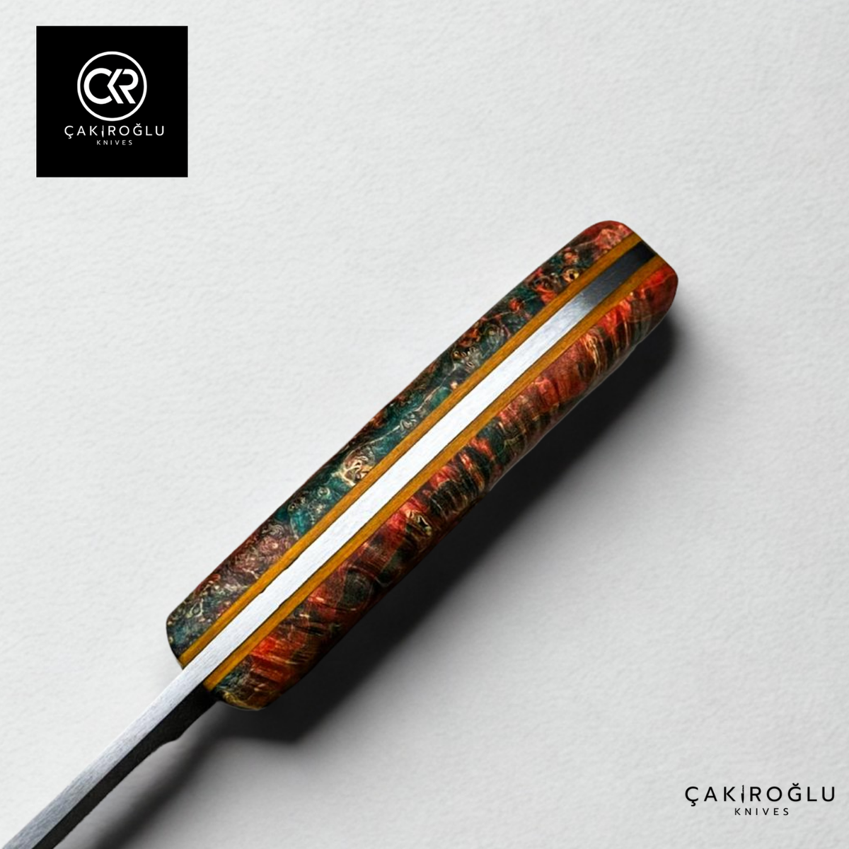 Crafted with the elegance of handcrafted artistry, this Damascus steel hunting knife offers a premium experience in both performance and aesthetics. The unique patterns of hand-forged steel give each knife a distinctive character while providing superior sharpness and durability. The stabilized handle combines the texture of natural materials with modern techniques to create a long-lasting structure that is resistant to moisture and impact. With its eye-catching color transitions and shiny surface, this knife is both a collectible work of art and a reliable companion in nature. Meticulously crafted in every detail, this model represents the pinnacle of modern craftsmanship inspired