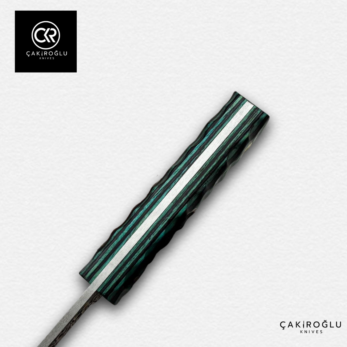 The special laminated wood used in the handle is known as a high-quality material preferred in gun stocks. Its strength, durability, and aesthetic appearance make it one of the strongest complementary elements of the Seiryu Tanto. Its texture, reminiscent of deep waves of green and black, visually reflects the name “Blue Dragon.”