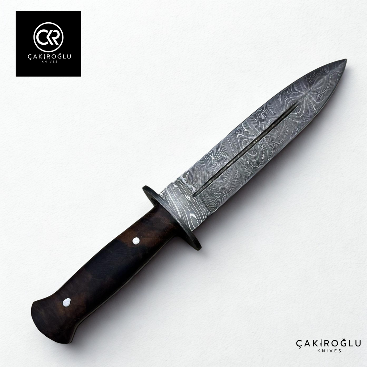 The Çakıroğlu Damascus Dagger stands as a bold collector’s piece, uniting the soul of hand-forged steel with the timeless beauty of natural wood.