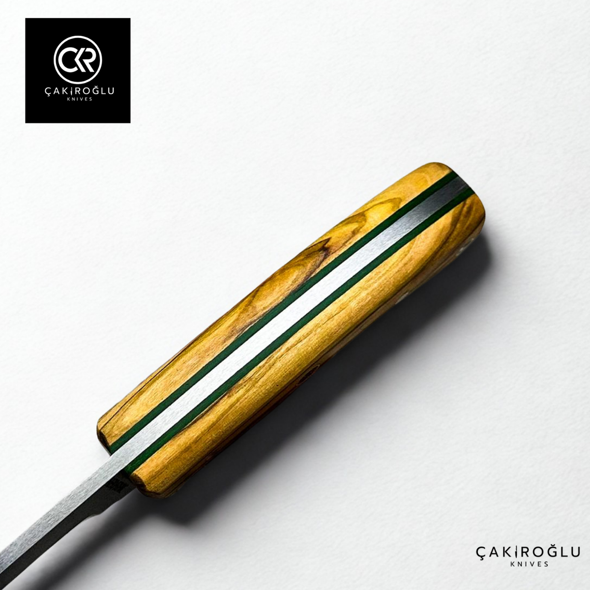 The olive wood handle, meticulously handcrafted and polished, provides a warm, natural feel and a secure grip. Its distinctive grain pattern not only enhances the knife’s aesthetics but also ensures excellent control and balance during use.